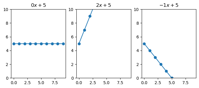 Here we see that when \(\beta_1\) is 0 (left figure), any change in \(x\) results in 0 change in \(y\). While, with \(\beta_1 = 2\), \(y\) increases two-fold by every change in \(x\). Finally, when the slope is negative, we see that \(y\) decreases.