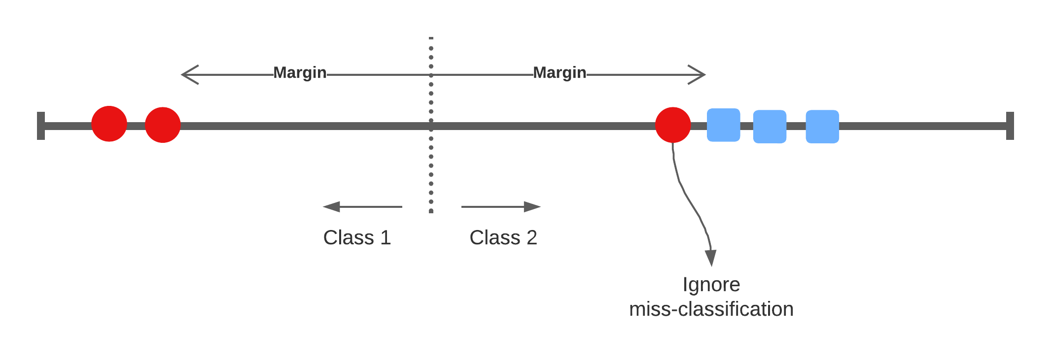 This type of classifier is called the Support Vector Classifier with a soft-margin as it allows for miss-classifications to reduce the model’s variance.