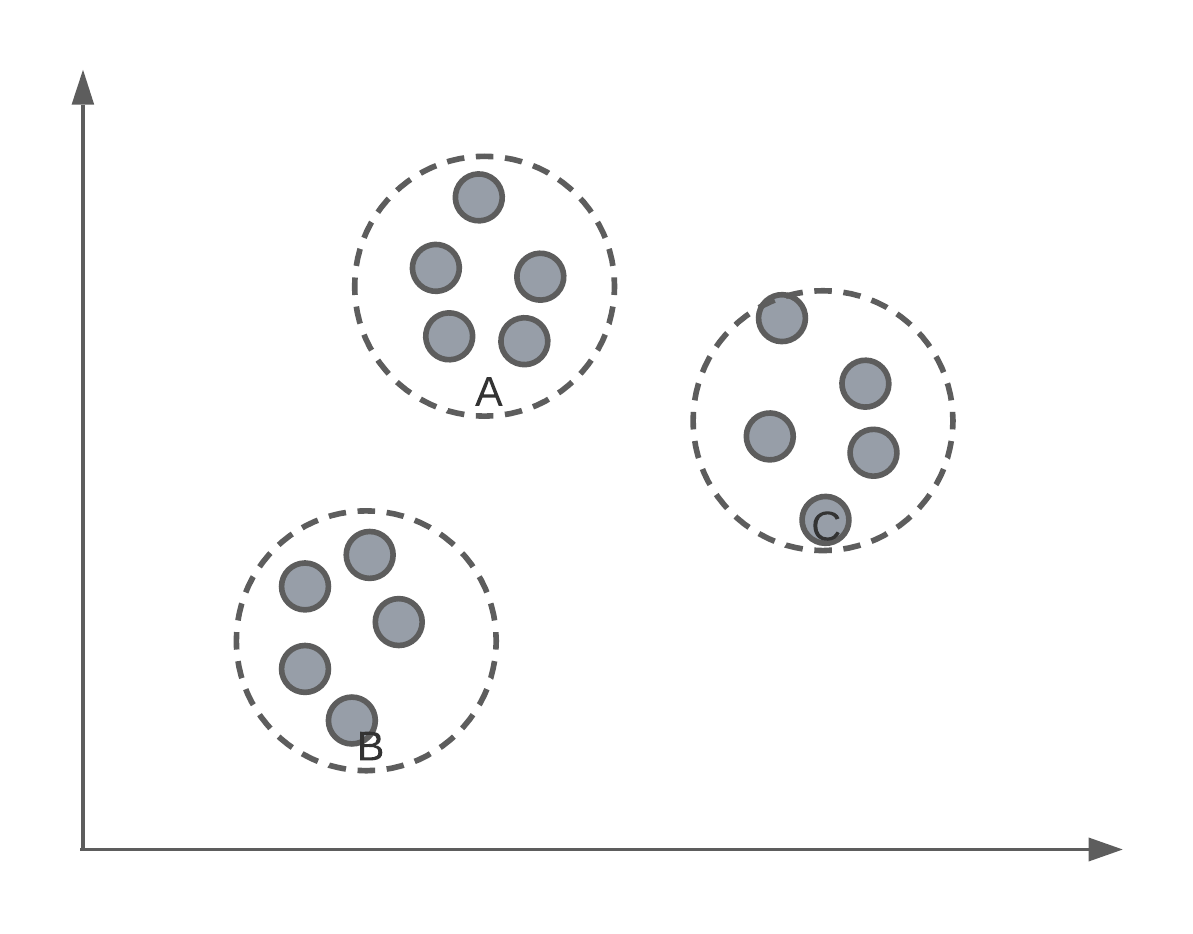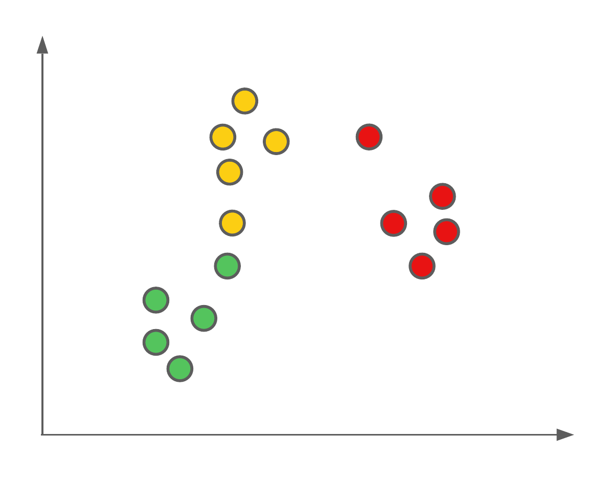 K-means is an iterative algorithm, which means that the centroids of the clusters will be randomly assigned in the feature space. Let’s say that we initialise a K-means algorithm with \(K = 3\). We might have something that looks like: