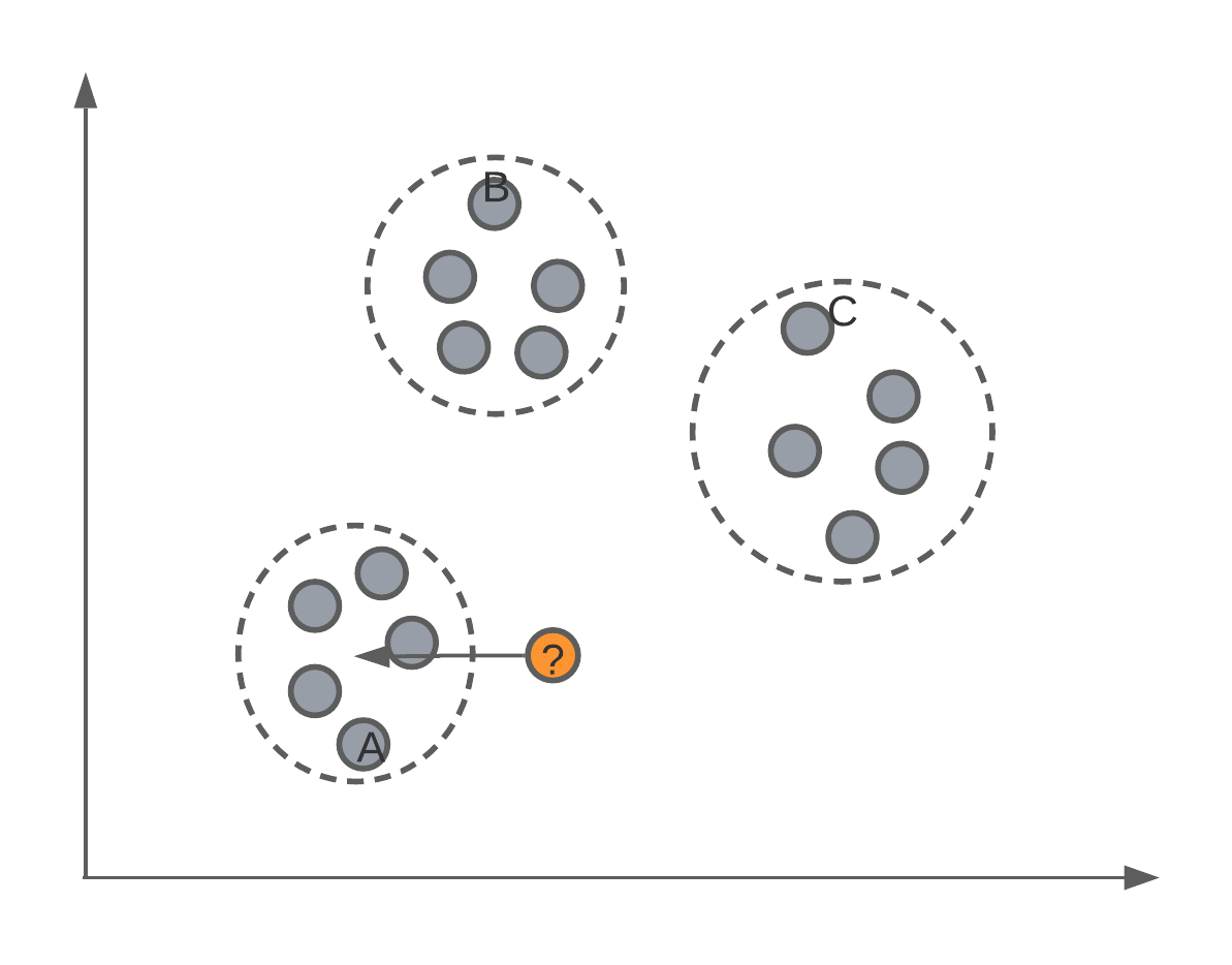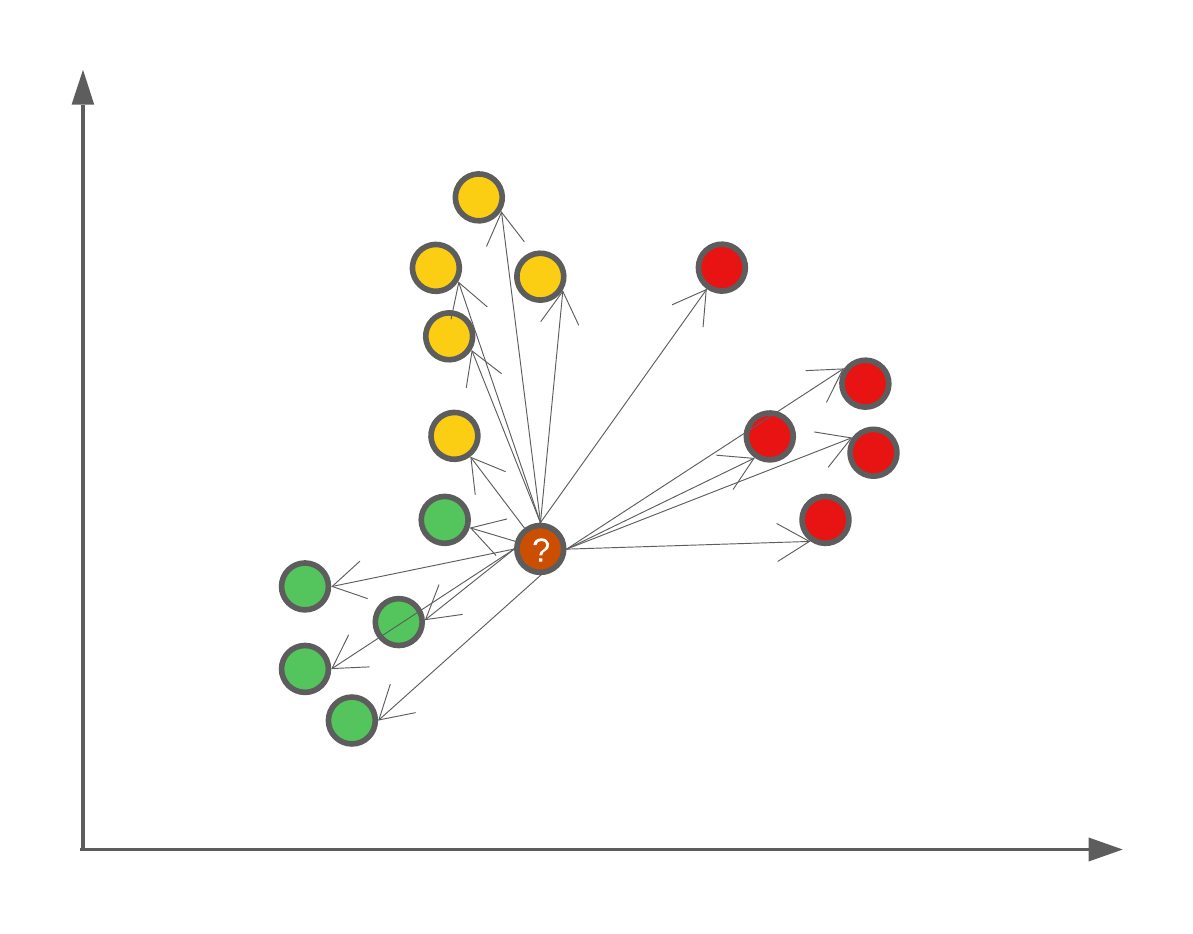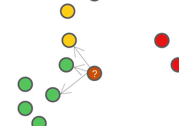 Let’s say we set \(K=3\), this means that when we have a new data point we want to classify, we’re going to find out where this new data point falls in the feature space, and find 3 of it’s closest neighbours. Using these closet neighbours, we will assign this new data point the same class as the class majority of it’s neighbours.